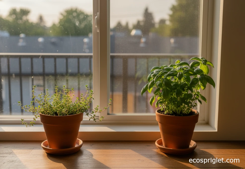 - Thyme or rosemary: More tolerant of drier soil and strong sun; good candidates for the brightest spot on the sill.